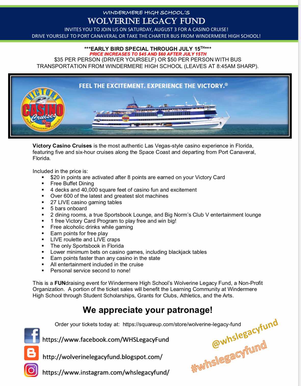 Early Bird Pricing for our Victory Casino Cruise ends July 15. Prices increase by $10 on July 16!  Get you tickets by visit: https://squareup.com/store/wolverine-legacy-fund
