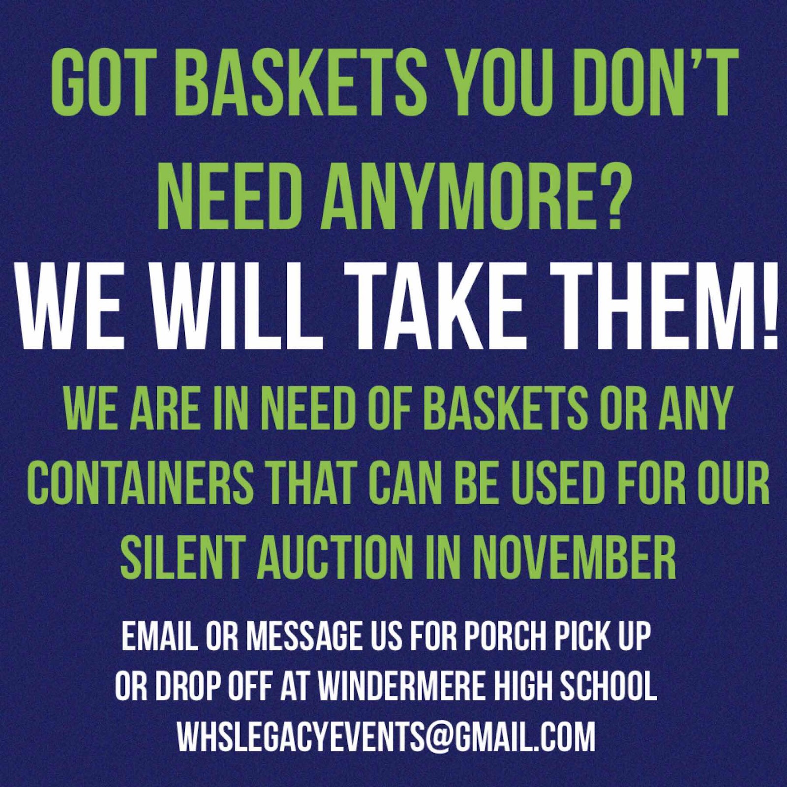 We have a meeting on August 29 in the Media Center. Please bring any basket, container, pail etc that you no longer want! We can use it for our Silent Auction!!